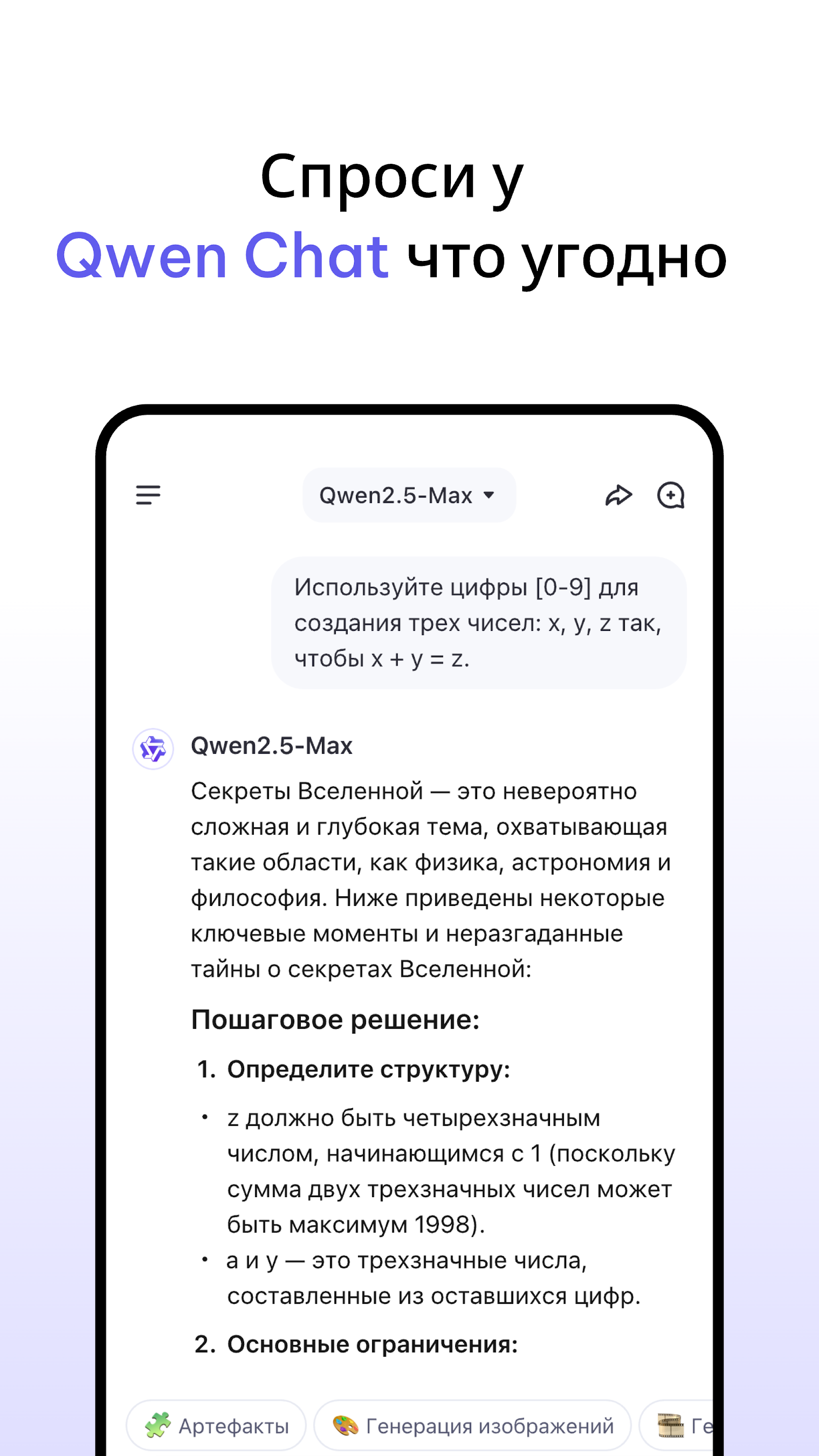 Qwen Chat служит надежным источником знаний и эмоциональной поддержки. Независимо от того, интересуетесь ли вы тайнами Вселенной, историческими загадками или просто нуждаетесь в понимающем собеседнике, ассистент всегда готов помочь.