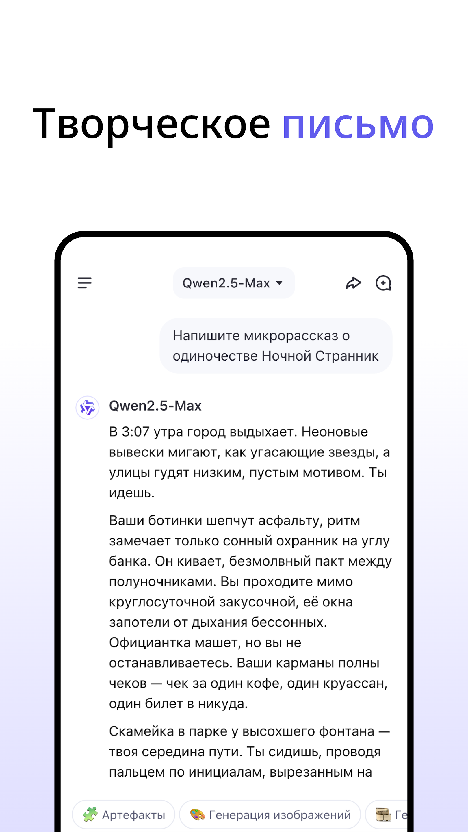 Раскройте свой творческий потенциал с помощью инновационных функций написания текста от Qwen Chat. Независимо от того, работаете ли вы над статьями, романами, эссе или академическими работами, ассистент предлагает свежие идеи и неиссякаемое вдохновение.