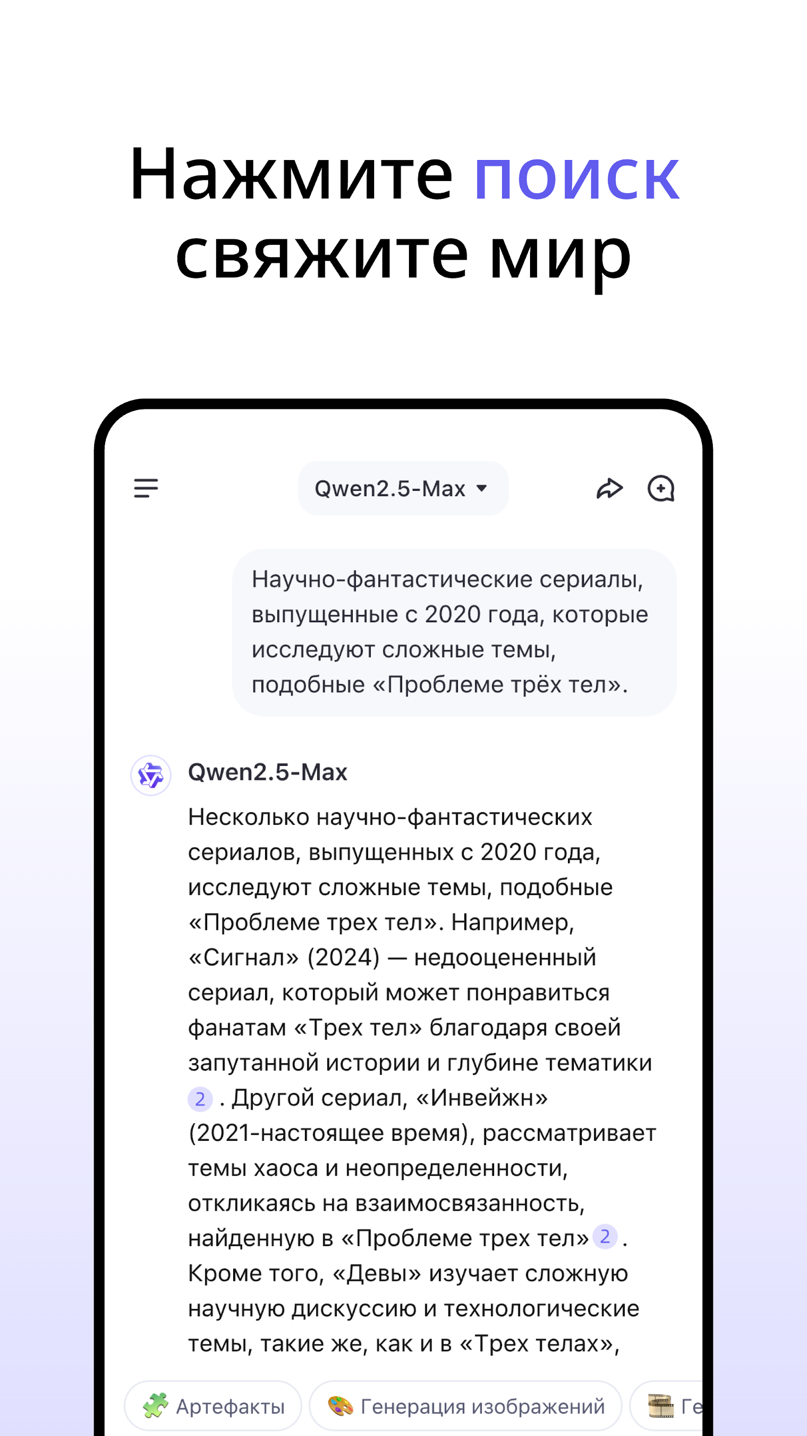 Qwen Chat предоставляет мощный инструмент для интеллектуального поиска, позволяя быстро находить ответы, ресурсы и источники вдохновения по всему интернету. Благодаря продвинутой фильтрации и контекстному пониманию, система выдает точные результаты, соответствующие вашему запросу.